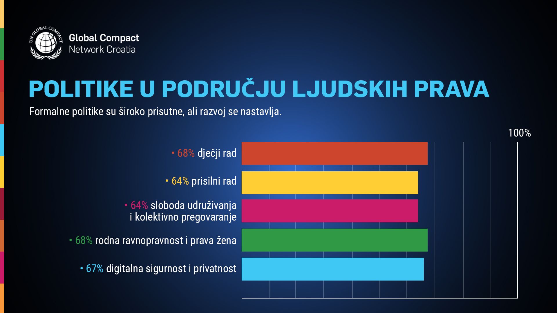 Većina poduzeća navodi da su ključne teme ljudskih prava obuhvaćene postojećim politikama ili formalnim okvirima. Međutim, činjenica da dio organizacija tek planira njihovo uvođenje kroz naredne dvije godine ukazuje na potrebu daljnje formalizacije obveza, osobito u kontekstu novih europskih regulatornih zahtjeva i očekivanja tržišta.