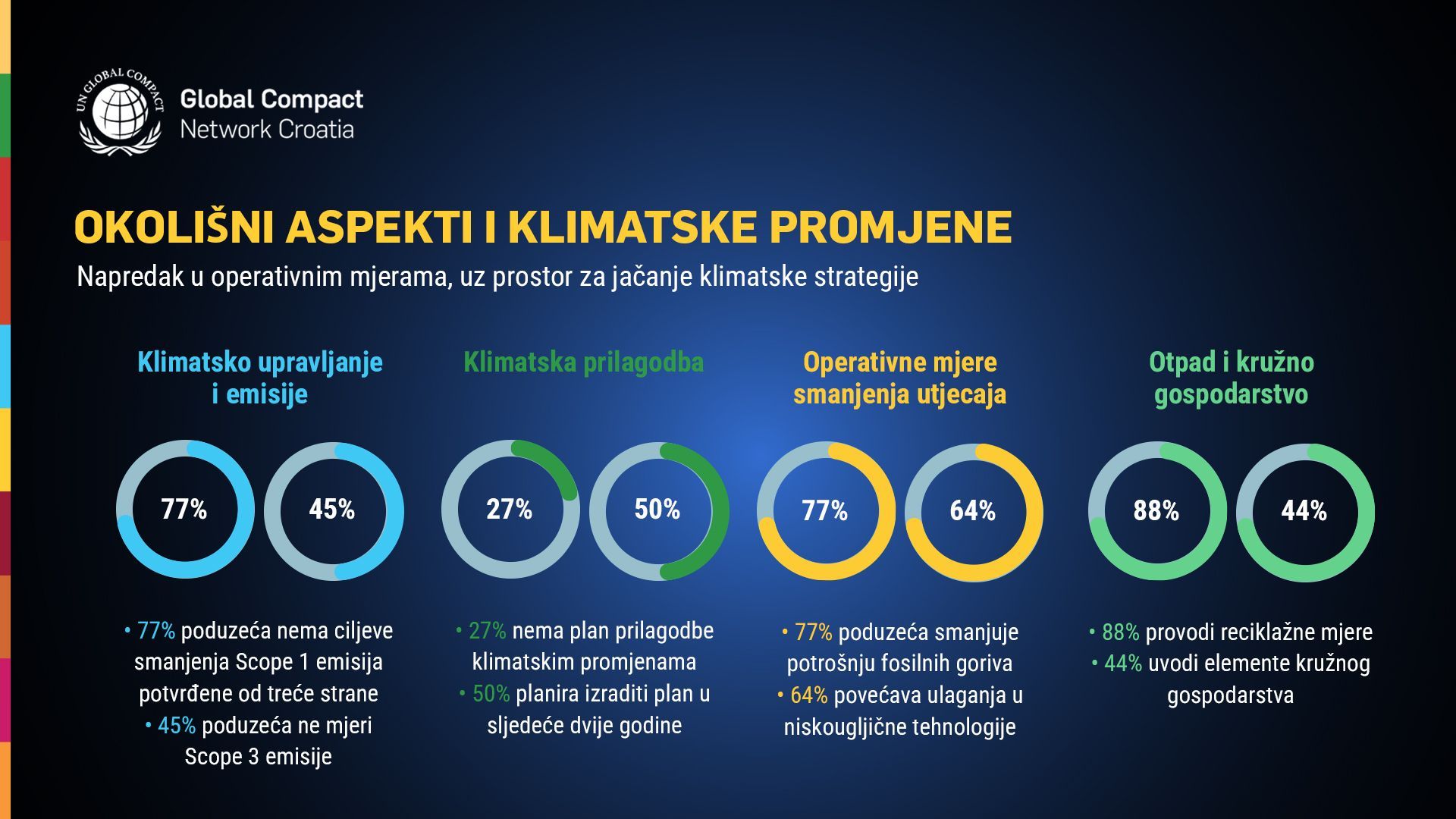 Rezultati pokazuju da kompanije ostvaruju vidljiv napredak u operativnim mjerama smanjenja okolišnog otiska, uključujući energetsku učinkovitost, ulaganja u niskougljične tehnologije i upravljanje otpadom. Istodobno, strateški elementi klimatskog upravljanja – poput validiranih ciljeva smanjenja emisija i mjerenja emisija u lancu vrijednosti – još su u razvoju, što ukazuje na potrebu daljnjeg jačanja dugoročnog pristupa klimatskoj tranziciji.
