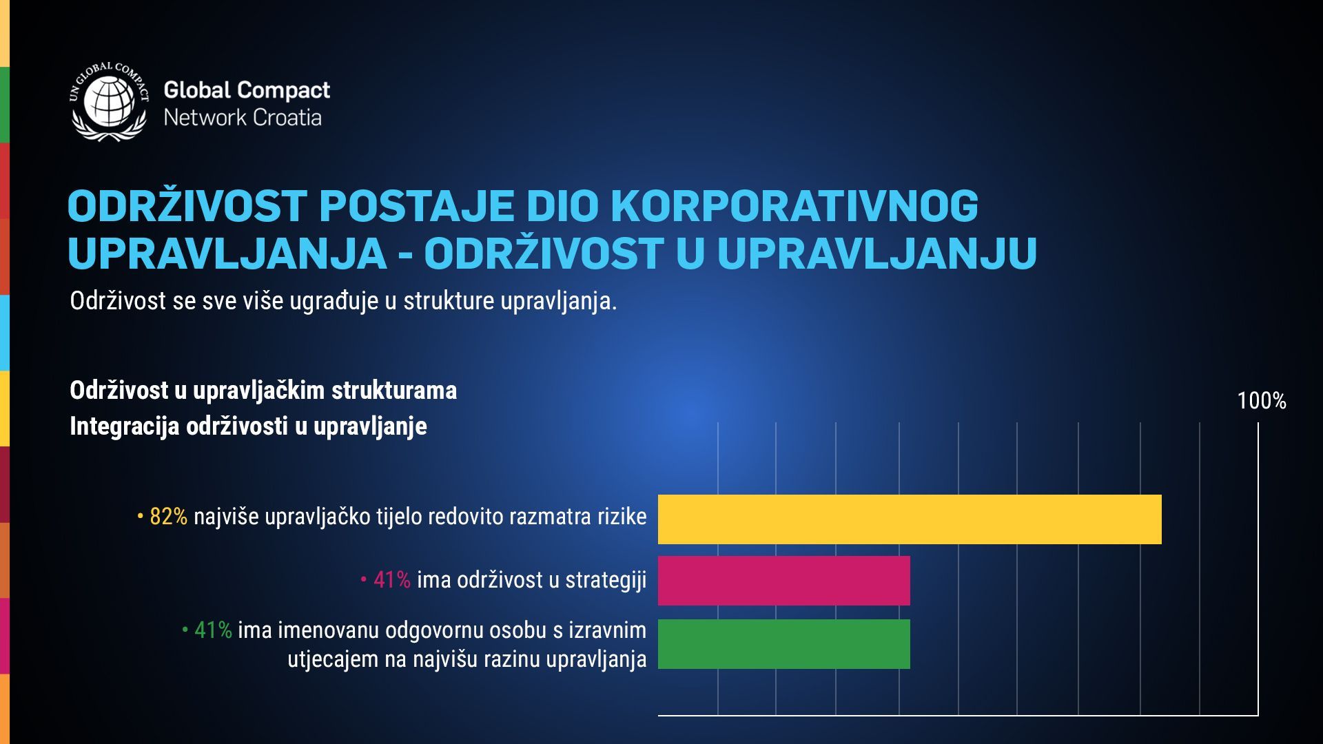 Rezultati pokazuju da se održivost postupno pomiče s operativne na stratešku razinu upravljanja, uz sve češće uključivanje najvišeg vodstva u procjenu rizika i donošenje odluka. Istodobno, ograničena povezanost održivosti s nagrađivanjem menadžmenta te neravnomjerna rodna zastupljenost u vrhu organizacija ukazuju na prostor za daljnji razvoj upravljačkih praksi u skladu s načelima odgovornog poslovanja.