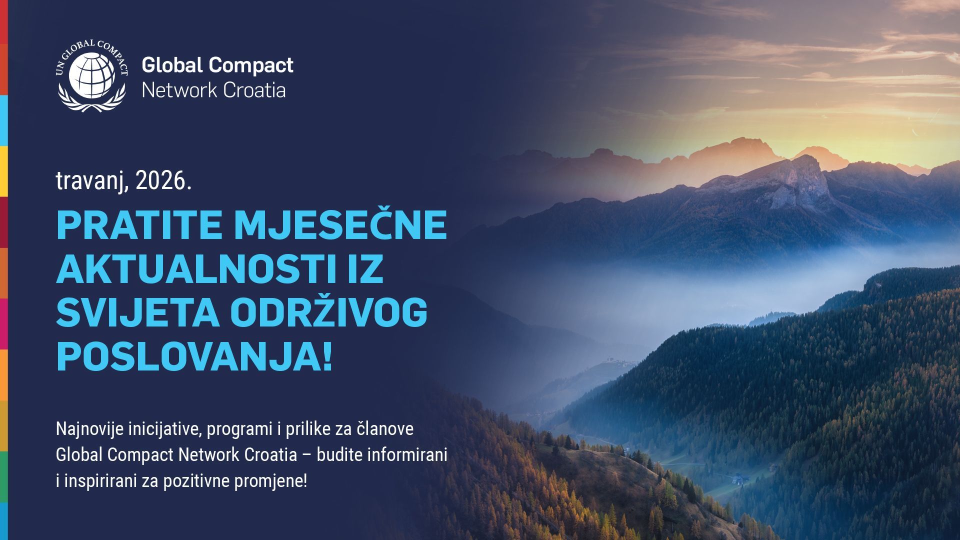 Nakon razdoblja postavljanja ciljeva i strateških okvira, fokus se sve snažnije pomiče na njihovu provedbu i integraciju u poslovne procese – od klimatskih planova i upravljanja ljudskim pravima do jačanja integriteta i rodne ravnopravnosti u praksi. Regulatorni zahtjevi postaju precizniji, očekivanja dionika jasnije definirana, a održivost se potvrđuje kao sastavni dio dugoročne otpornosti i konkurentnosti poslovanja. Ovo izdanje donosi pregled ključnih inicijativa, programa i događanja koja obilježavaju početak godine – uključujući poruku globalnog vodstva, objavu godišnjeg izvještaja, uvide iz Digital COP-a, aktualne akceleratorske programe te aktivnosti povezane s održivim financiranjem i Međunarodnim danom žena. U nadolazećem razdoblju naglasak ostaje na jačanju kapaciteta članica, razmjeni iskustava i sustavnoj provedbi ESG principa. Nastavljamo pružati podršku kroz programe, alate i aktivnosti koje doprinose razvoju odgovornog i održivog poslovanja.